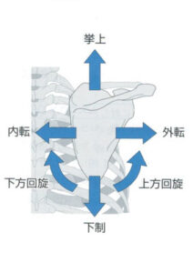 肩甲骨の基本的な動きは上図のような動きになります。ちゃんと動いてくれる可動性も欲しいですが、安定性も必要な場所になります。